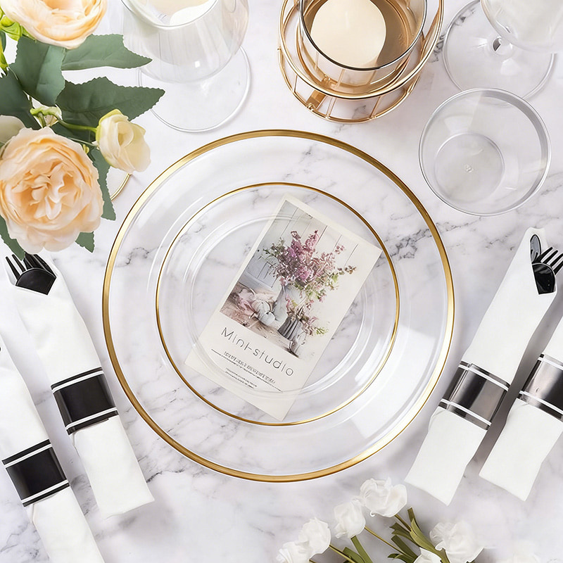 β¨ Clear Plastic Dinner Plate with Gold Rim: Elegant disposable plate with premium metallic accent