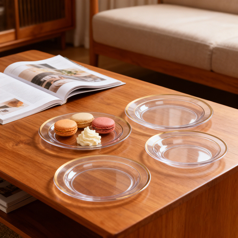 clear plate + gold rimElegant Gold Rim DesignοΌSleek gold trim on clear plate, elevates dining & serving aesthetic