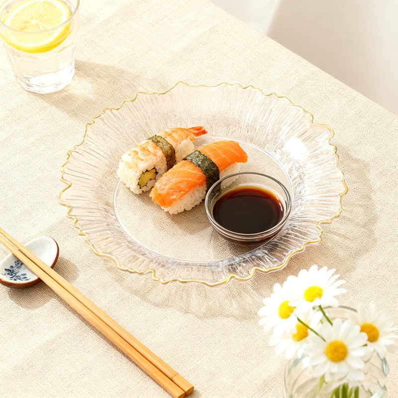 Artistic & Elegant Design: Unique free-form irregular silhouette for a modern, artistic look; crystal-clear body showcases food’s colors and textures, paired with a delicate gold rim trim that adds a refined, luxurious finish to table settings.