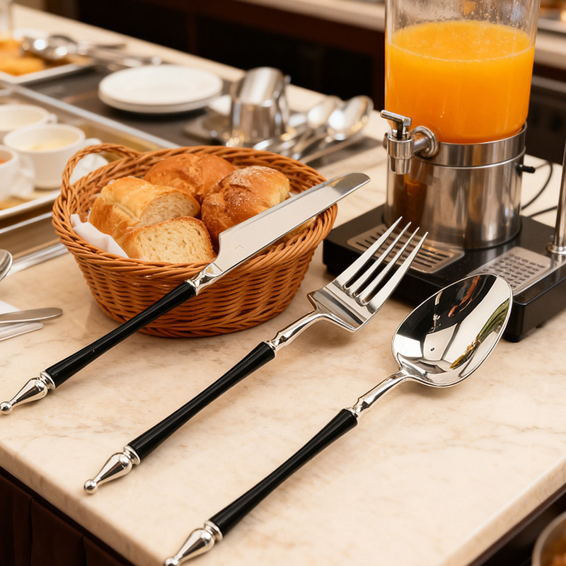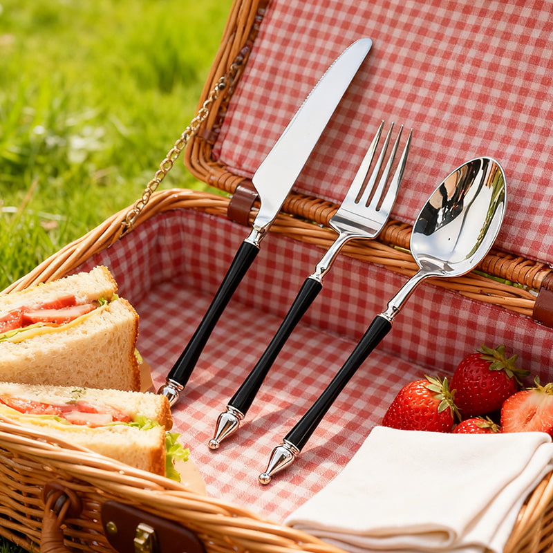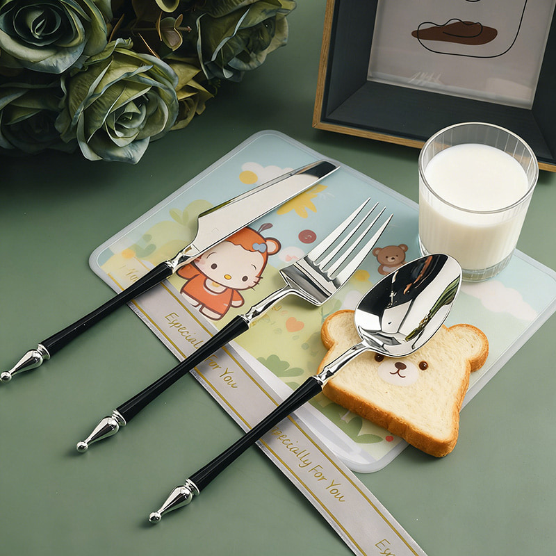 Silver head + black handleComplete 5-Piece Set:Knife, fork, spoon, tea fork, tea spoon (matching item numbers)