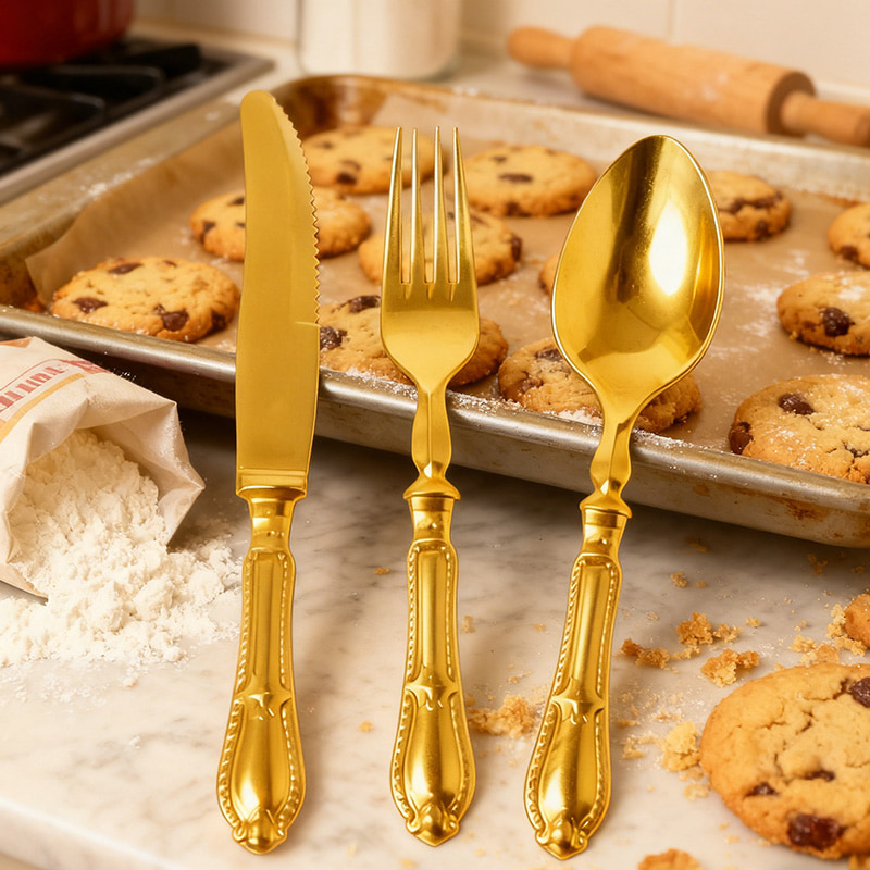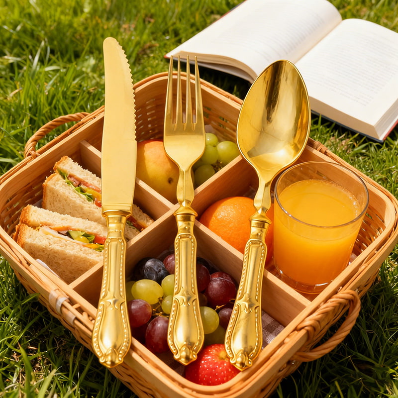 GoldPremium Safe Material: Disposable 3-piece cutlery set (knife, fork, spoon) made of high-grade food-safe BPA-free plastic; sturdy, bend-resistant, and durable enough to handle steaks, cakes, salads, and gourmet dishes without warping or breaking.