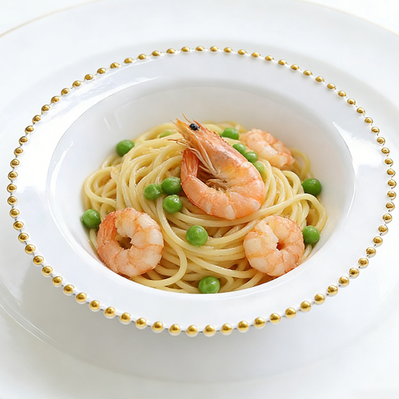 The handcrafted gold pearl beaded edge elevates the classic white bowl, turning casual picnics and formal weddings into elegant affairs.
